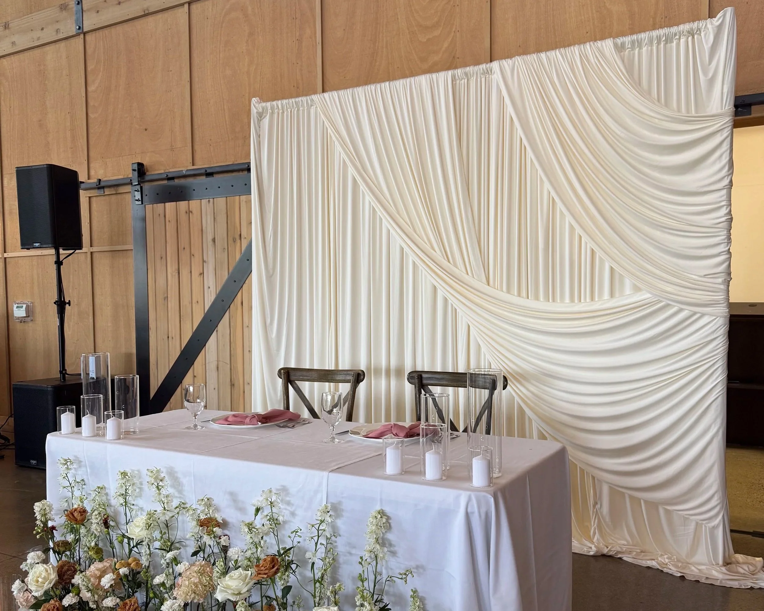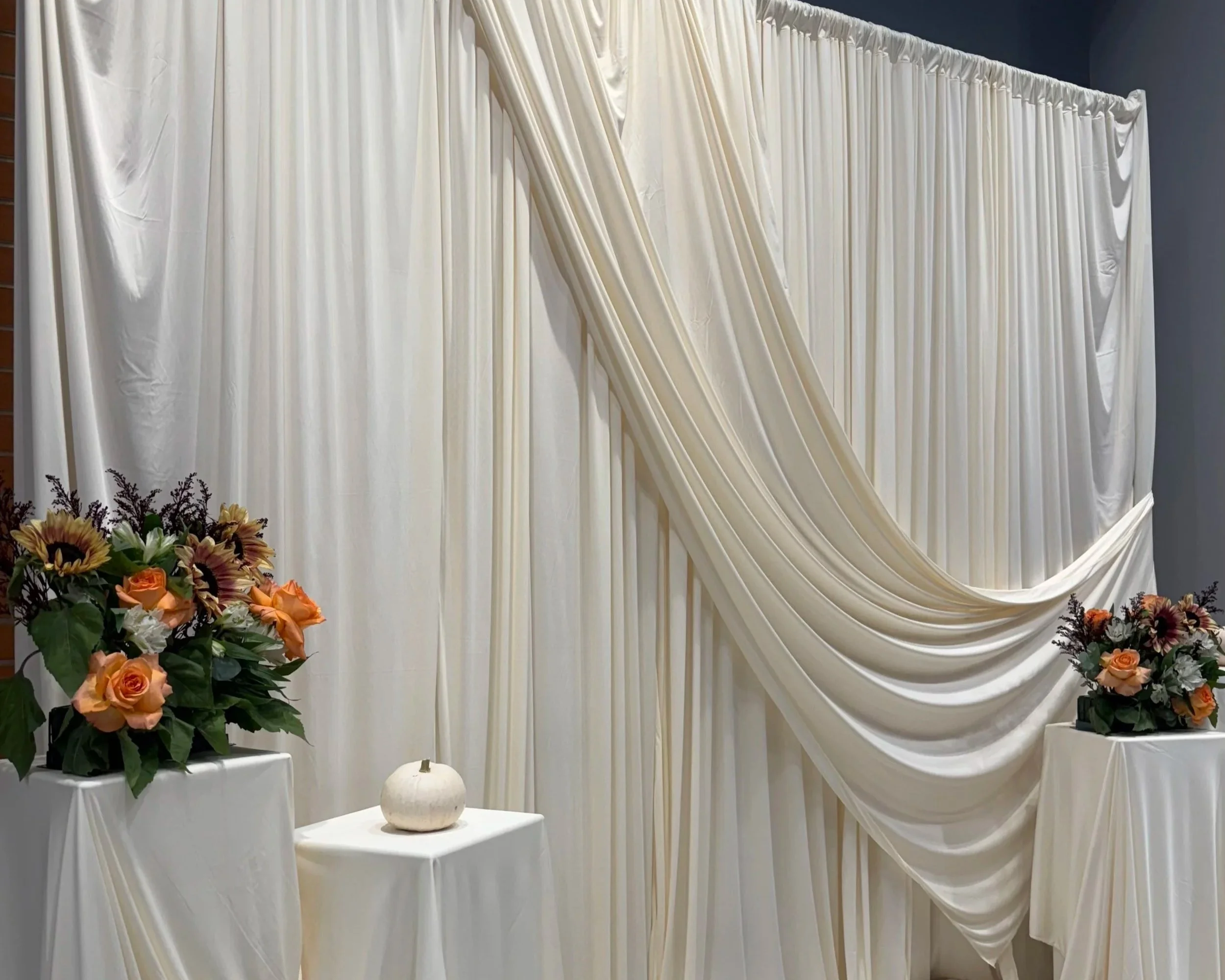 Description: Heavy-duty adjustable backdrop stand (max load 33lbs.) with ivory fabric panels.